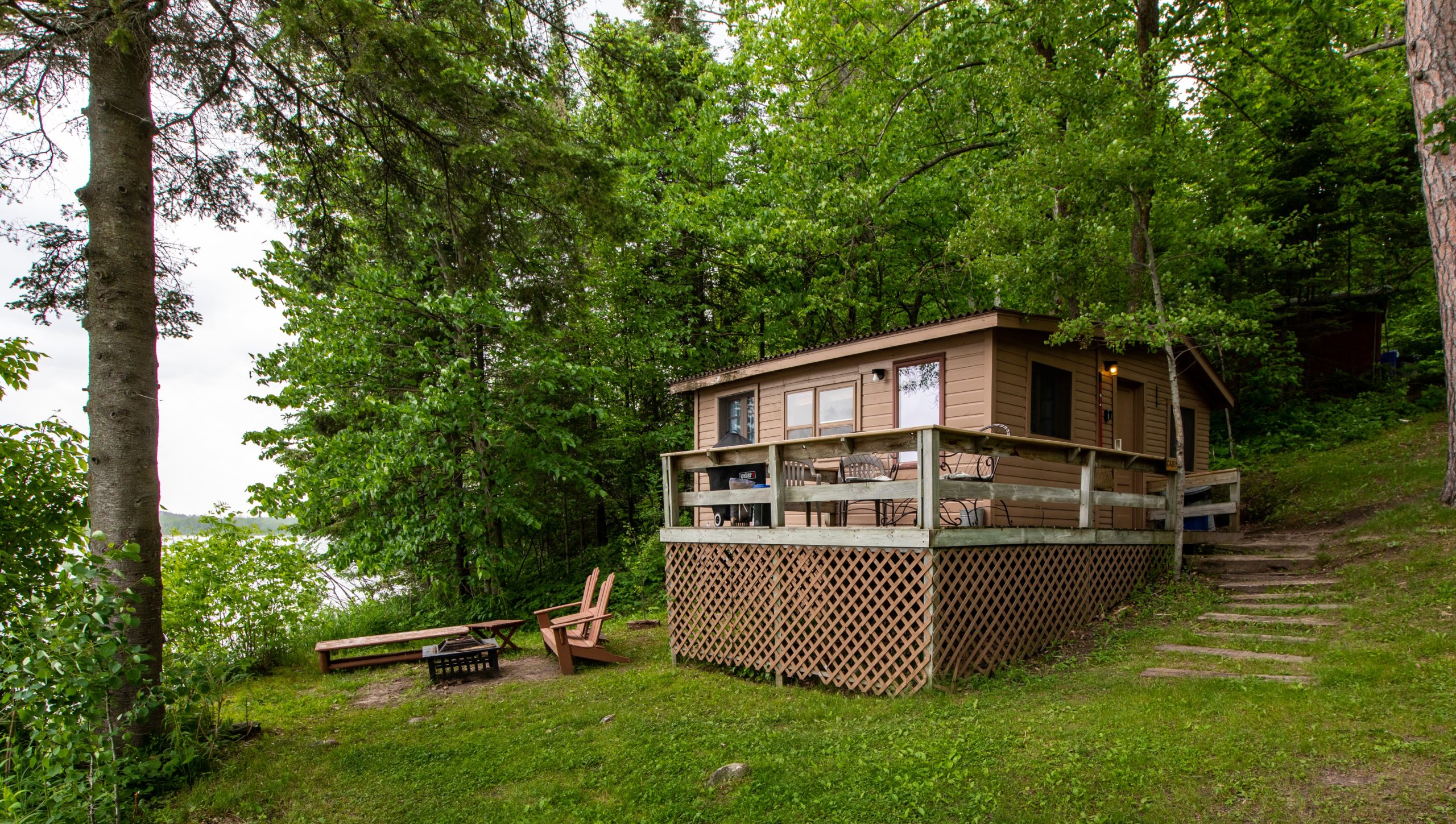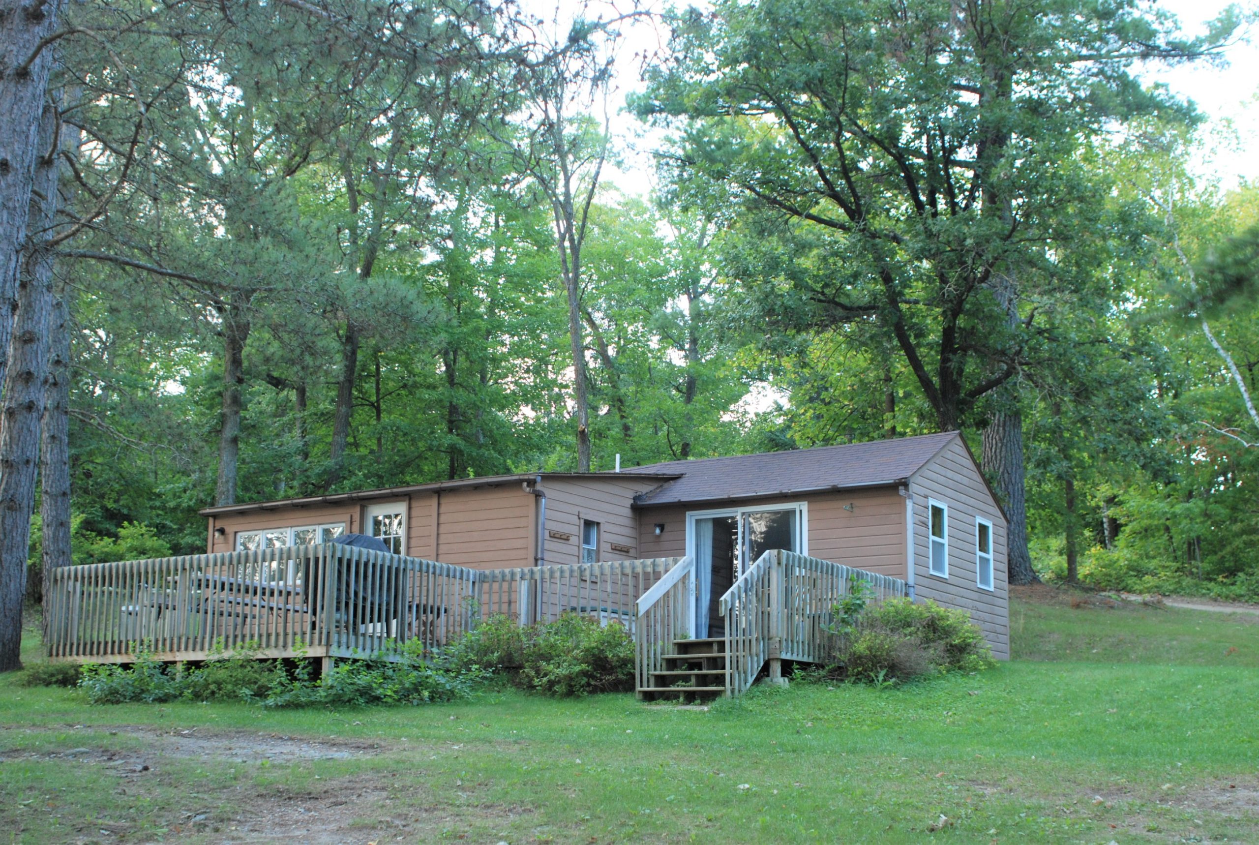 Is a three bedroom cabin with a sleeper sofa in the living area and a bathroom with shower. The first bedroom contains a queen bed, second has a full bed, and the third has twin bunk beds. The living area and main bedroom have sliding glass patio doors with access to a large deck where you can relax and look out on the beautiful serene West Crooked Lake. Sleeps up to 6 people in beds, maximum of 8.
