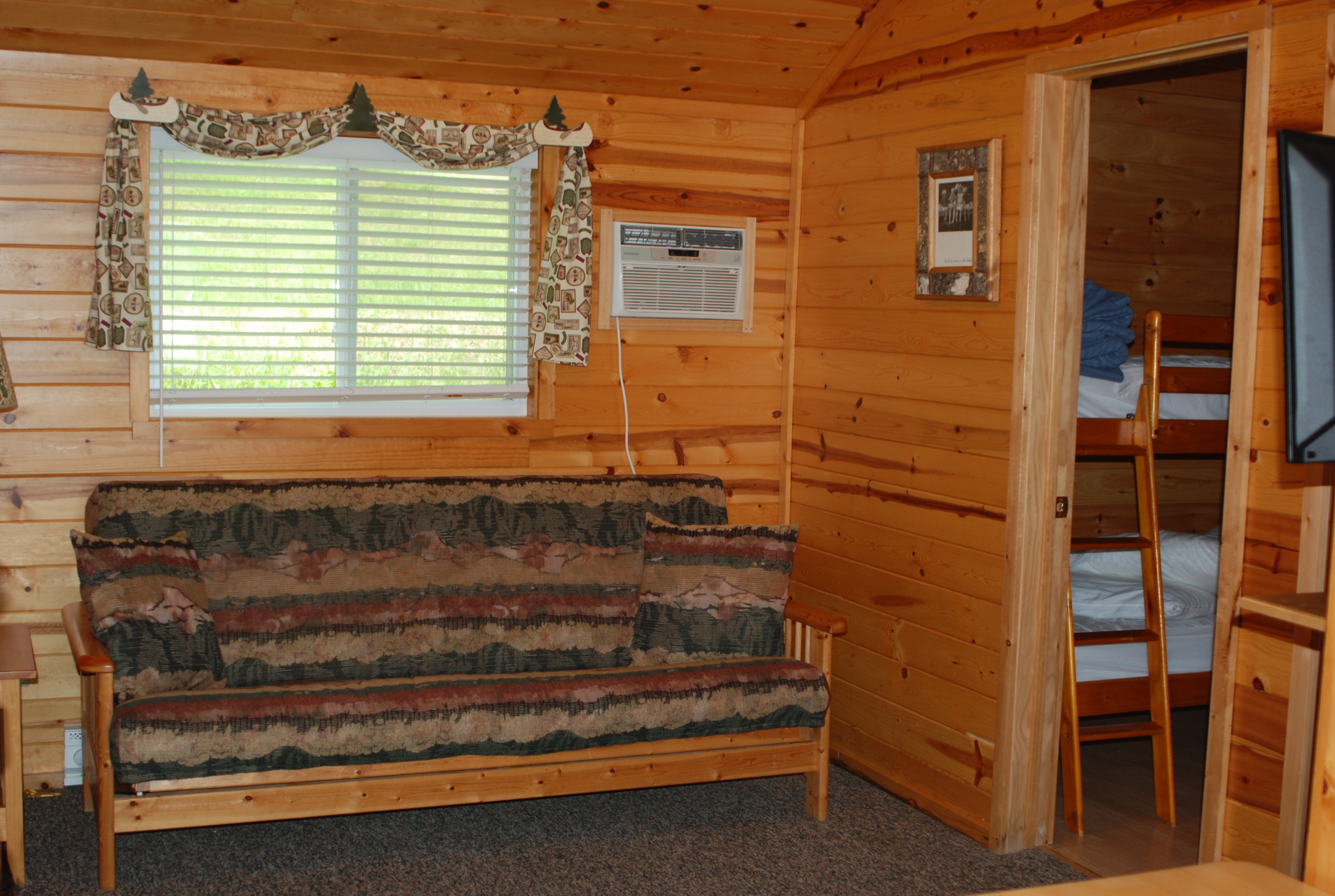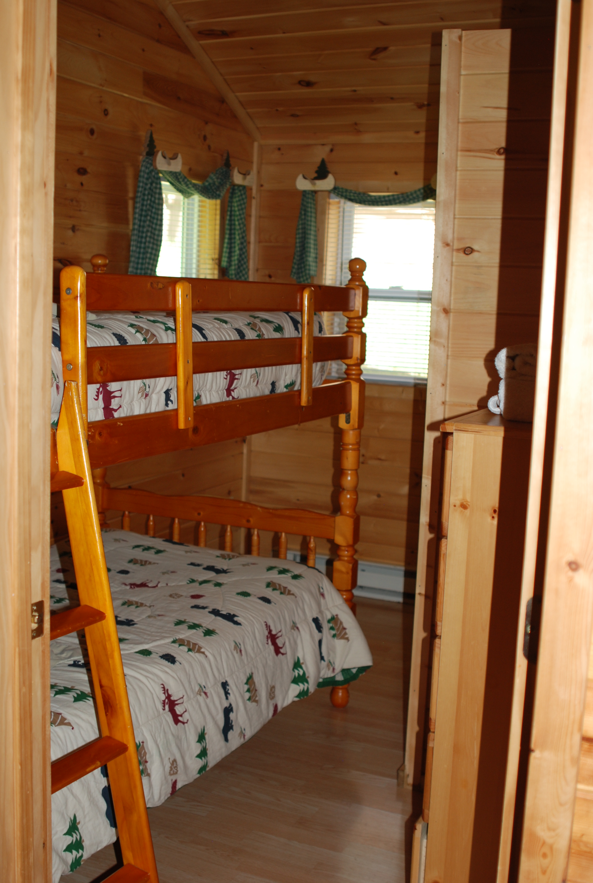 Is a two bedroom cabin with a sleeper sofa in the living area and a large bathroom with shower. The main bedroom contains a full bed and twin bunk beds and the second bedroom contains a full bed. The living area and the main bedroom have sliding glass patio doors with access to an extra large deck where you can relax and enjoy a wonderful view. Sleeps up to 6 people in beds, maximum of 8.