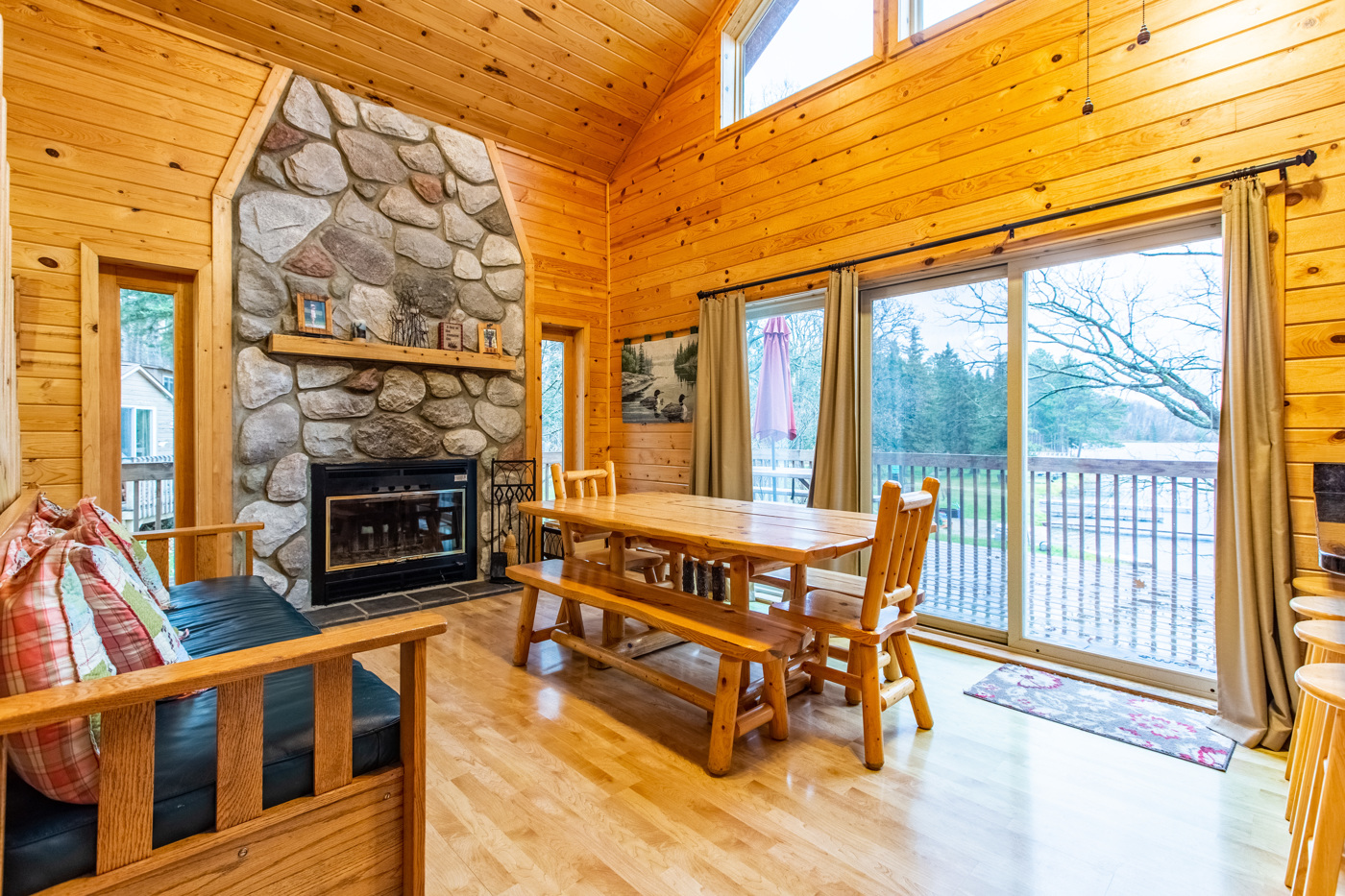Is a four bedroom cabin with a sleeper sofa in the basement and in the loft. The cabin contains a queen bed, two full beds and a full/twin bunk bed. A rollaway bed is also available. On the main level there is a large kitchen and living area, full bath, wood burning fireplace, and a sliding glass patio door with access to a wrap around deck. One bedroom and a large family area is located in the loft. The basement contains a family area with a laundry room with full size washer and dryer, bathroom with shower, and two bedrooms. From the basement a sliding glass door leads to the patio area adjacent to the picnic grounds and beach . Sleeps up to 10 people in beds, maximum of 13.